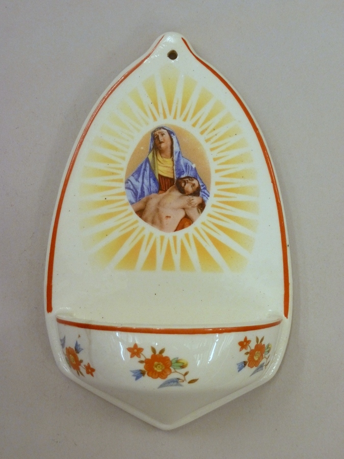 Wit wijwaterbakje met bewening in stralenkrans op achterwand en met bloemen op bakje