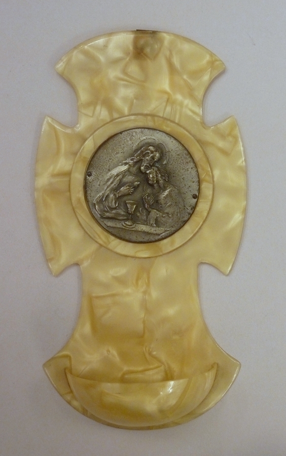Wijwaterbakje met medaillon met Christus en Johannes de Evangelist