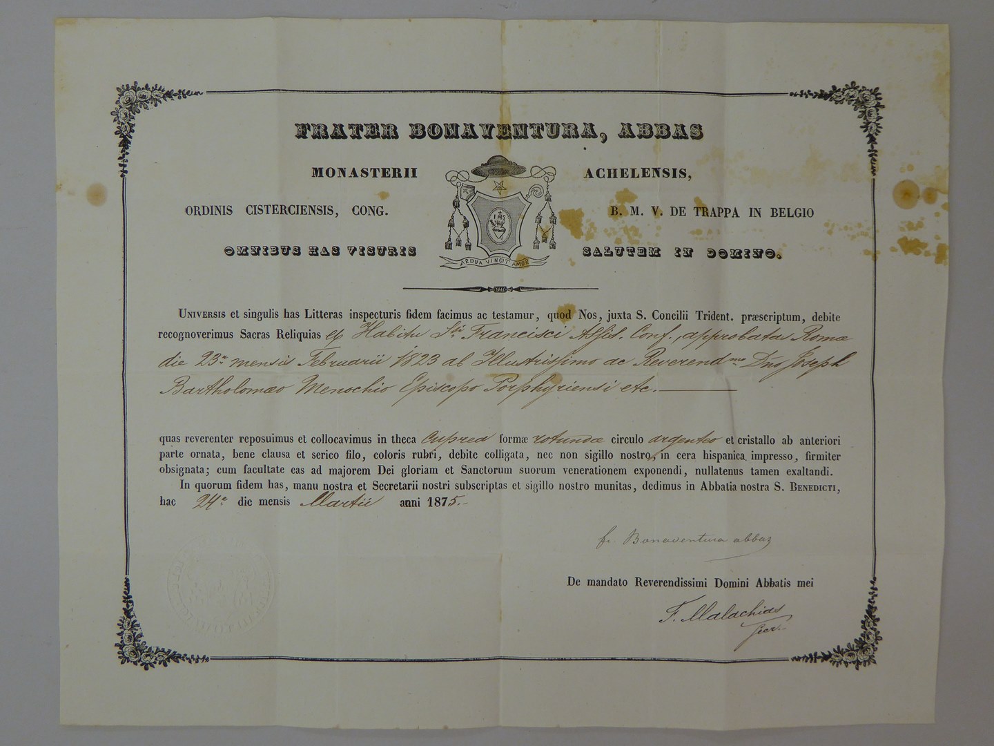Echtheidsverklaring bij RMCC v81.23 met "Frater Bonaventura, abbas ..."