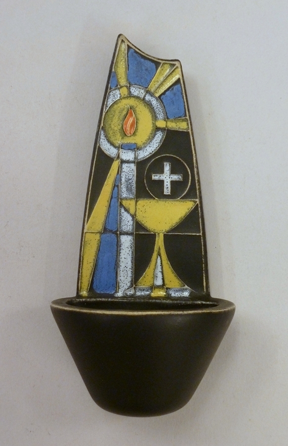 Zwart wijwaterbakje met kelk, kaars en hostie in geel, blauw, wit, zwart en rood