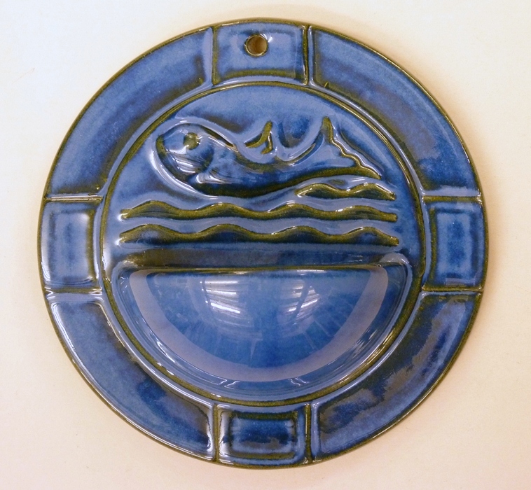 Rond blauw wijwaterbakje met vis