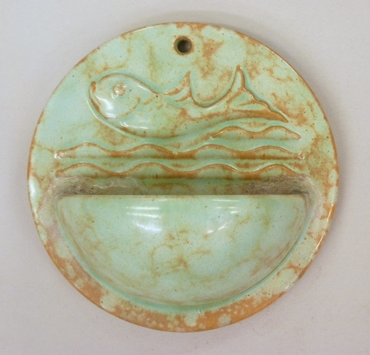 Rond groen gemarmerd wijwaterbakje met vis