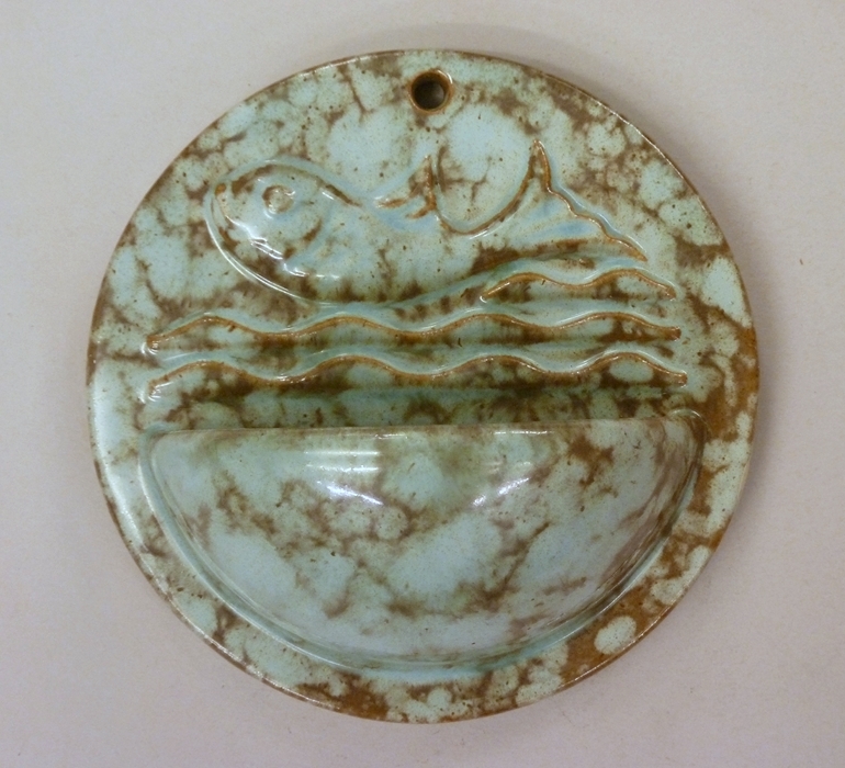 Rond blauw-bruin wijwaterbakje met vis
