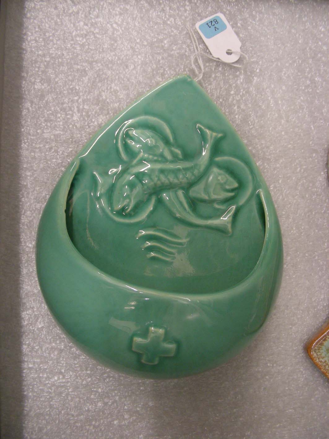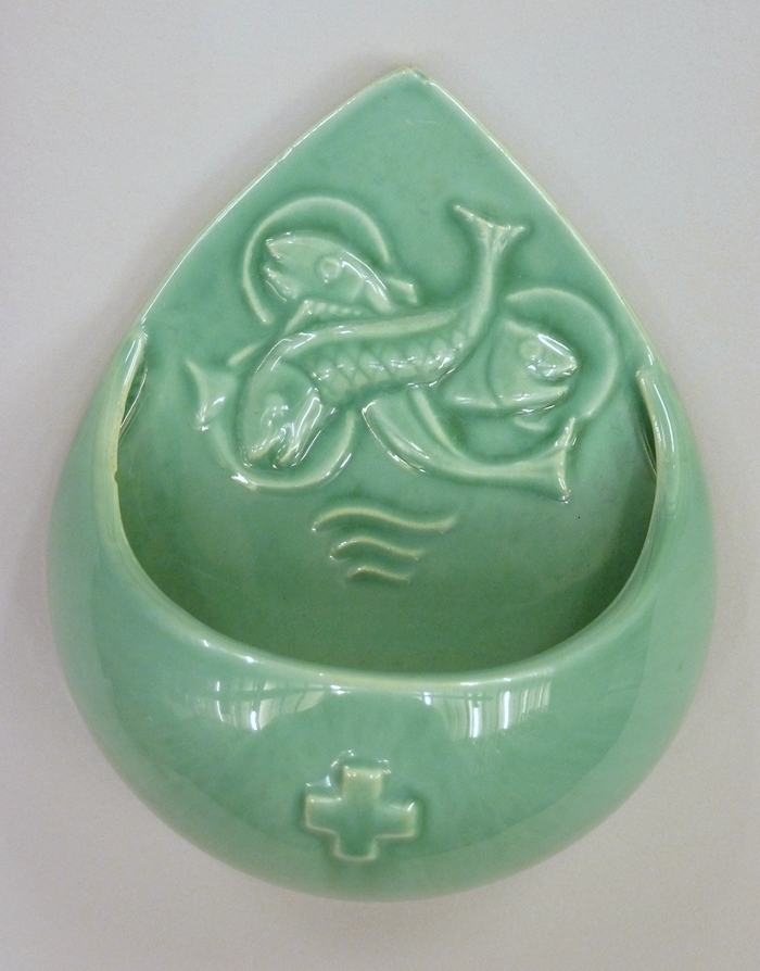 Groen wijwaterbakje met drie ineengestrengelde vissen op achterwand, bakje met kruisje