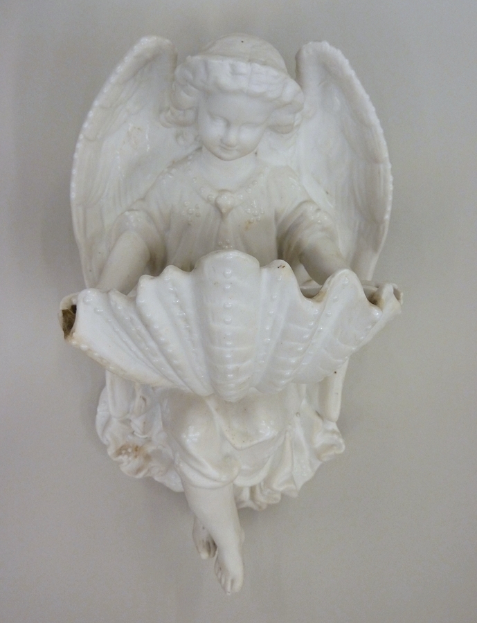 Wit wijwaterbakje, engel met bakje in schelpvorm