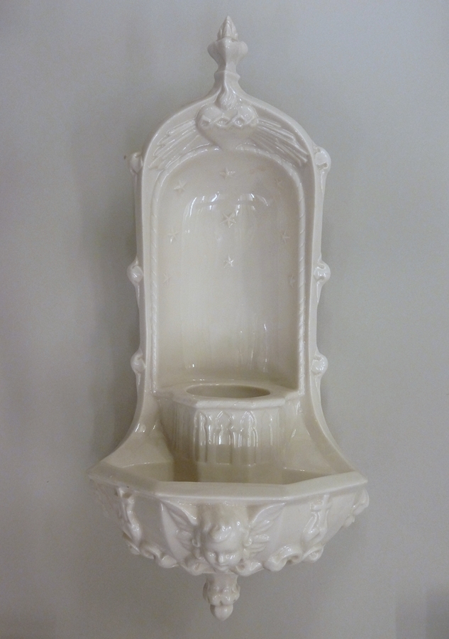 Wit wijwaterbakje, met stralend heilig hart, sterretjes in nis en drie cherubijntjes op bakje