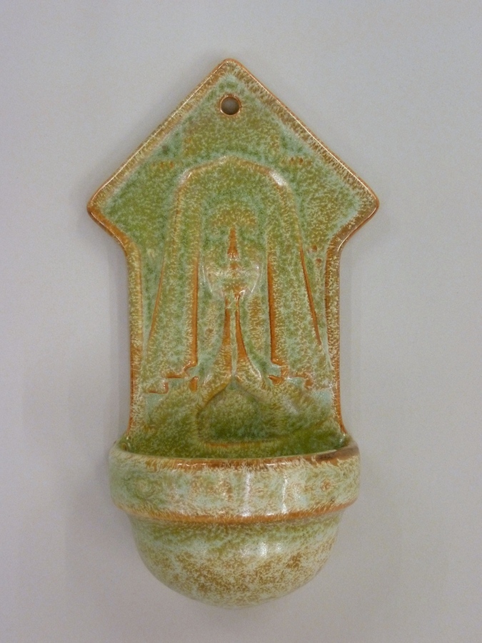 Groen-oker wijwaterbakje met biddende figuur op achterplaat, bakje met "Amen" op rand (slecht leesbaar)