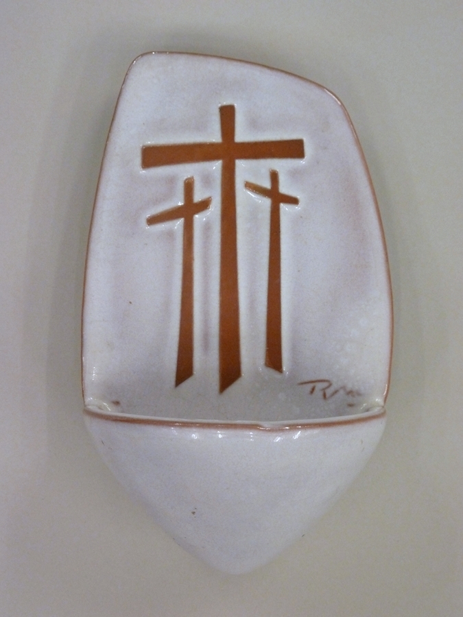 Wit wijwaterbakje met asymmetrische wandplaat met drie bruine kruisen