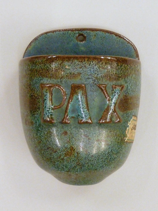 Blauwgroen wijwaterbakje met "PAX" op bakje