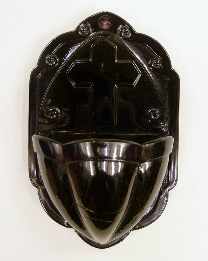 Donkerpaars wijwaterbakje met kruis en kleine voluten op wandplaat