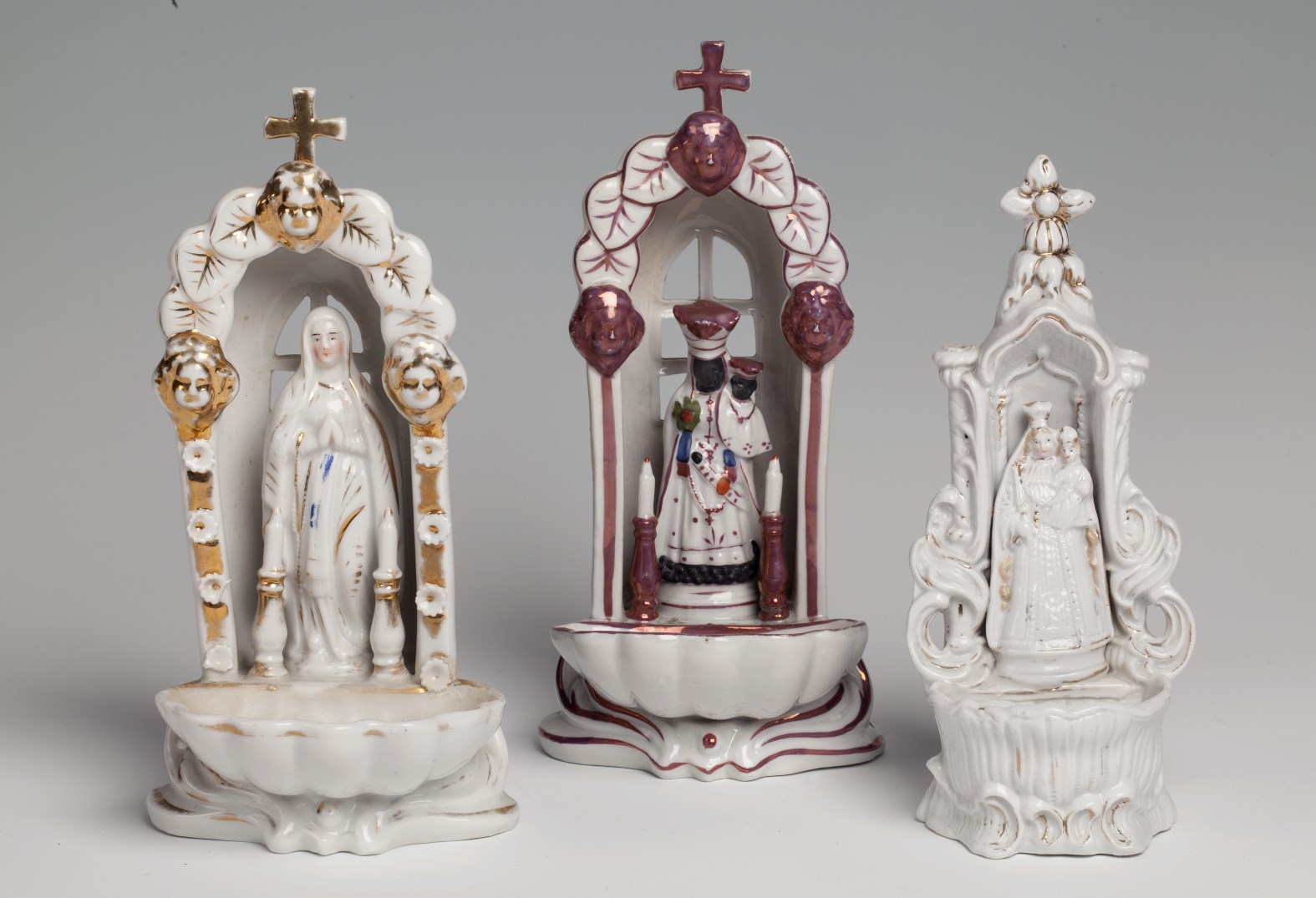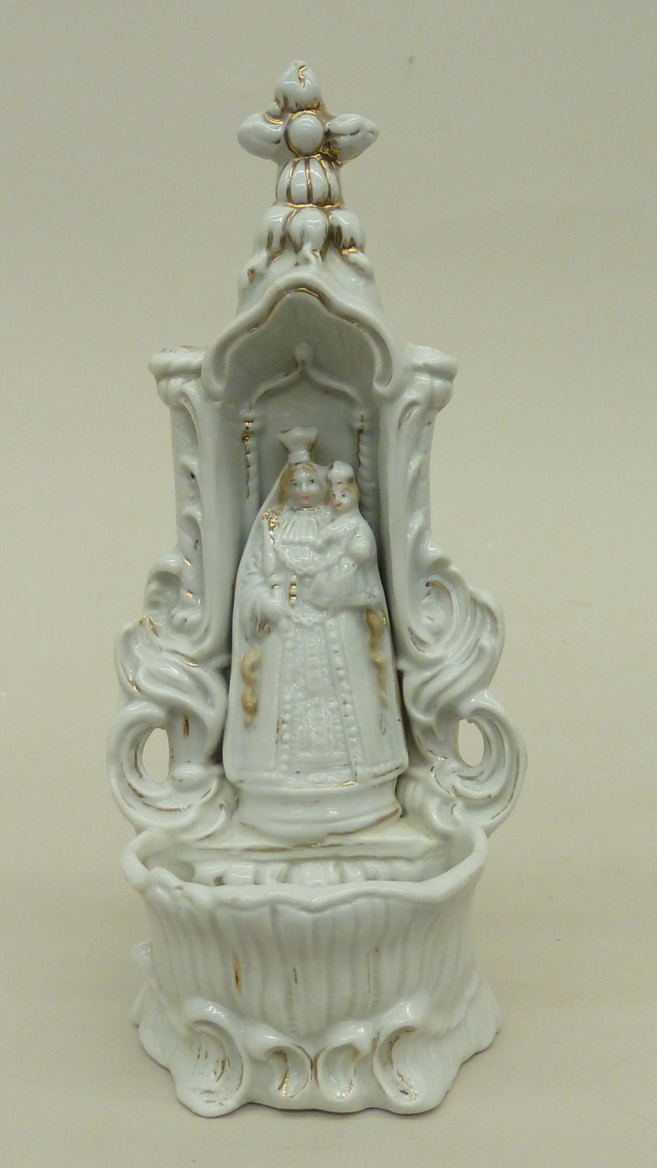 Staand wit wijwaterbakje met goudkleurige accenten met Maria met kind in nis