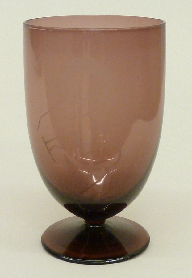 Paars glas op voet gegraveerd met Christus die hostie aan figuur geeft, eerste communiegeschenk(?)