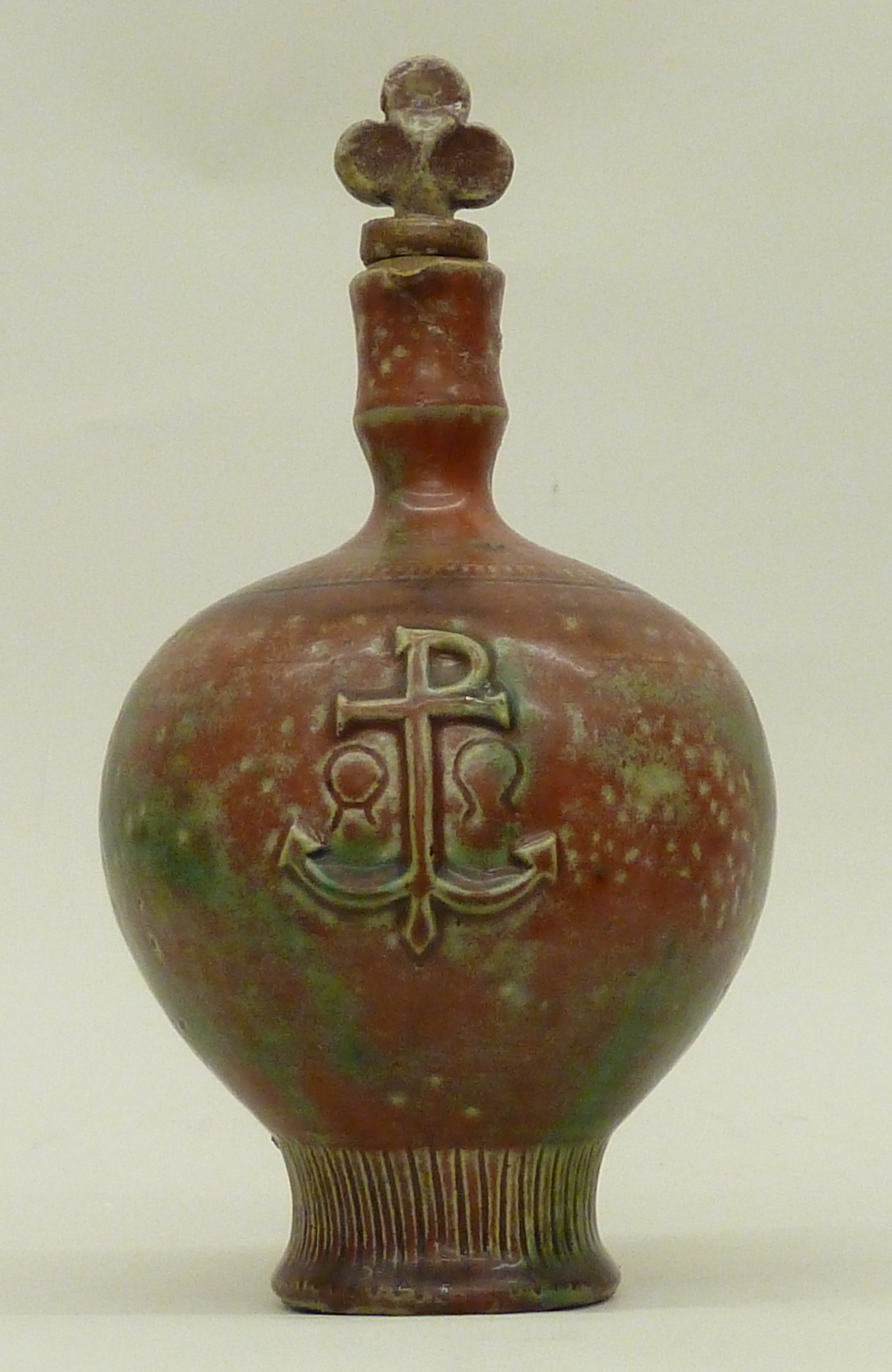 Rood-groene wijwaterkruik met oor en ankervormig Christusmonogram met alfa en omega