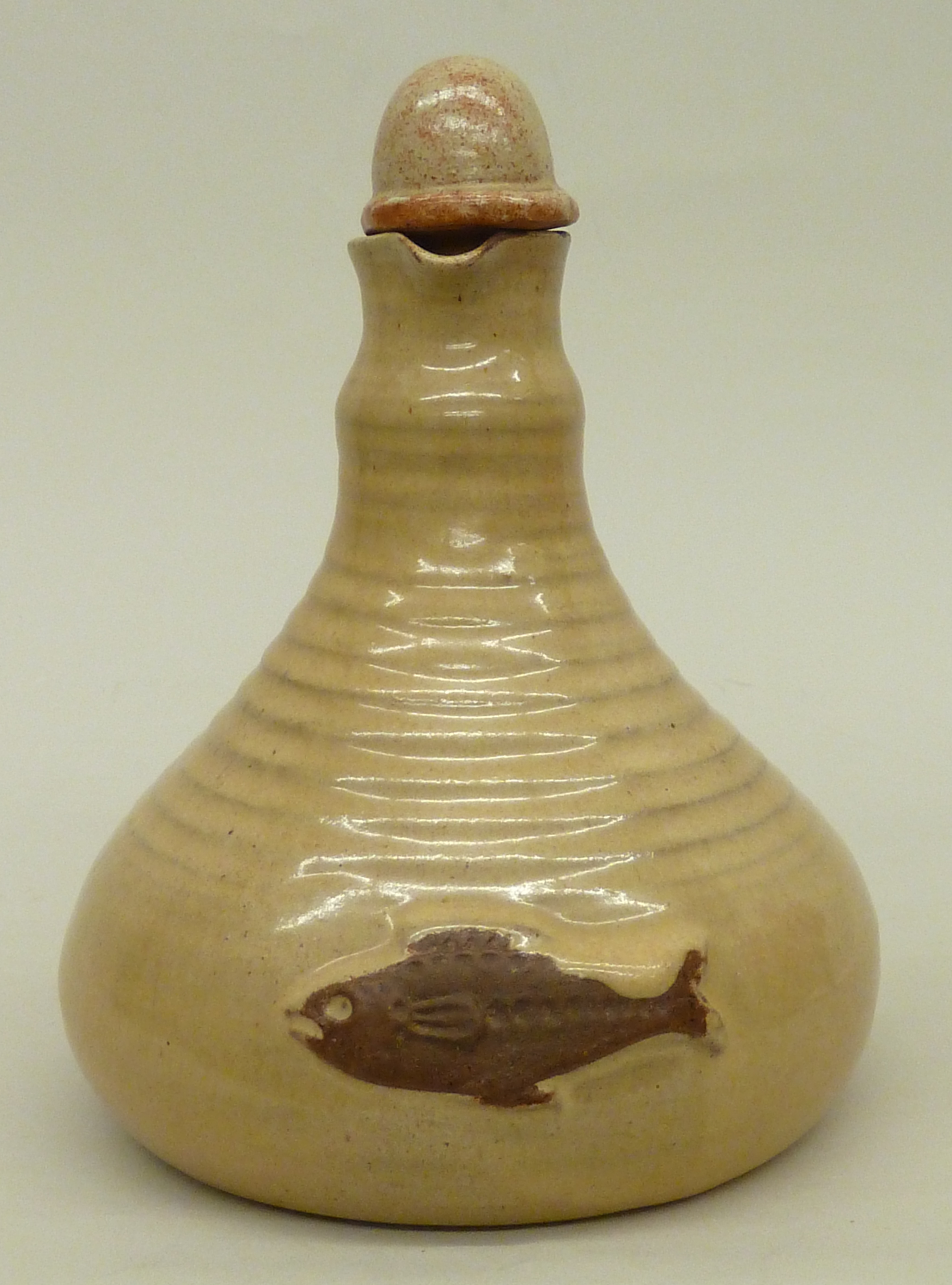 Lichtbruine wijwaterkruik met oor en ongeglazuurde vis