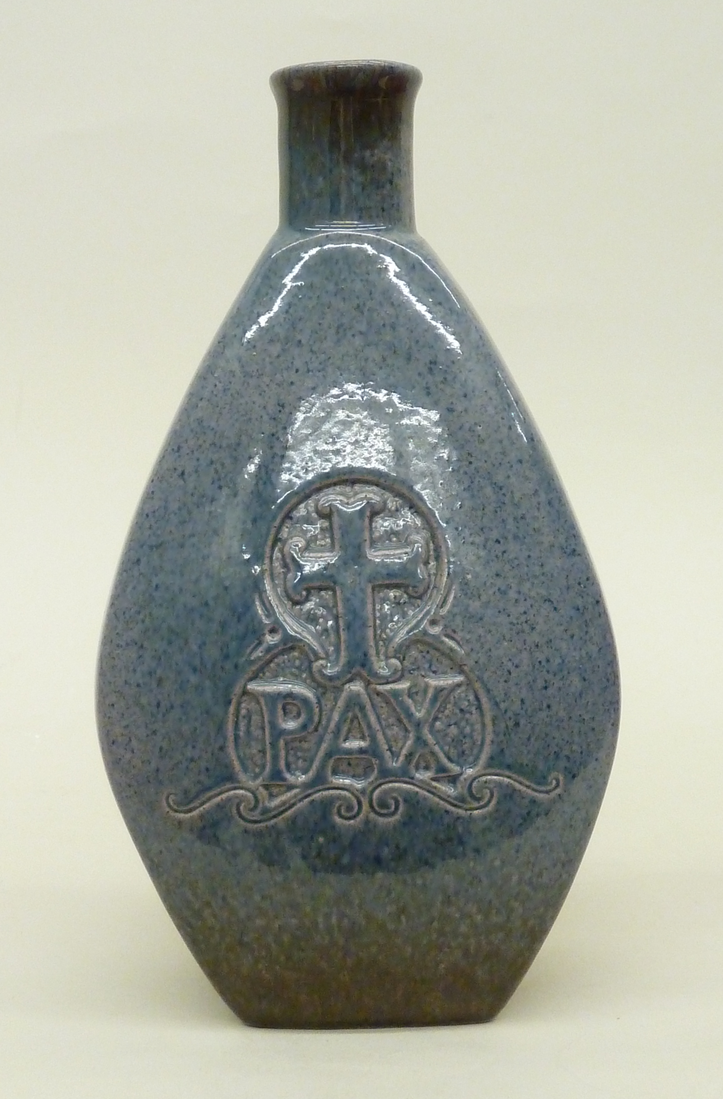 Blauwe wijwaterkruik met "PAX" en kruis op voor- en achterzijde