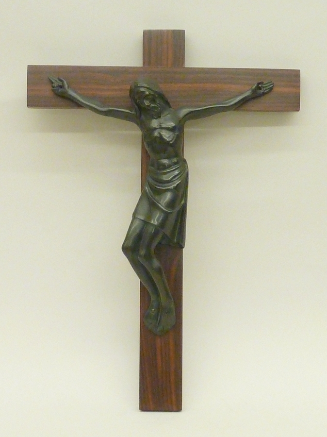 Palissanderhouten kruis met metalen corpus waarop op achterzijde "20e m.h nam: verb: made in holland"