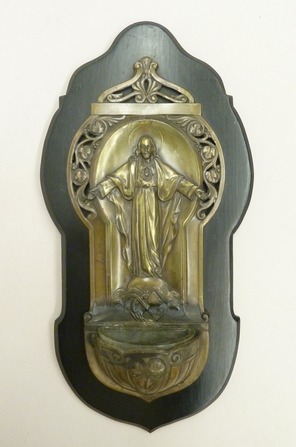 Metalen wijwaterbak met Christus met H. Hart staande boven lijdenswerktuigen, houten achterblad