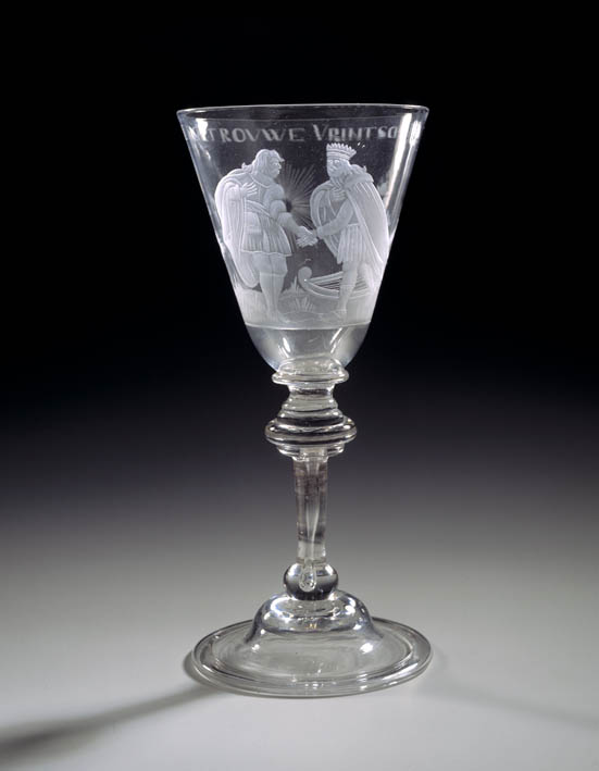 De tekst op dit glas luidt: 'De getrouwe Vrintschap'. Het bijbelse verbond tussen David en Jonathan leende zich bij uitstek voor de decoratie van een gelegenheidsglas die in de 18de eeuw populair werden om de vriendschap te beklinken.