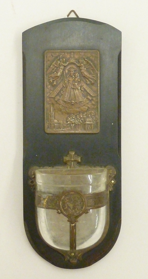 Wijwaterbak met plaquette met Maria van Kevelaer met "consolatrix afflictorum", houten achterblad
