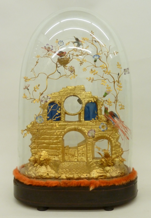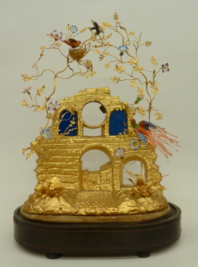 Stolp met goudgekleurde ruïne en takken met bloemen en vogels waaronder RMCC v863a staat