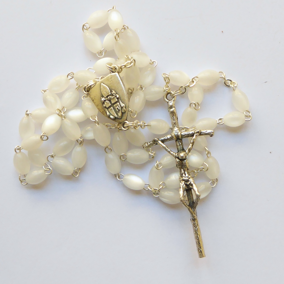 Rozenkrans met witte kralen, kruisbeeldje en plaatje met achterop wapen paus Johannes Paulus II