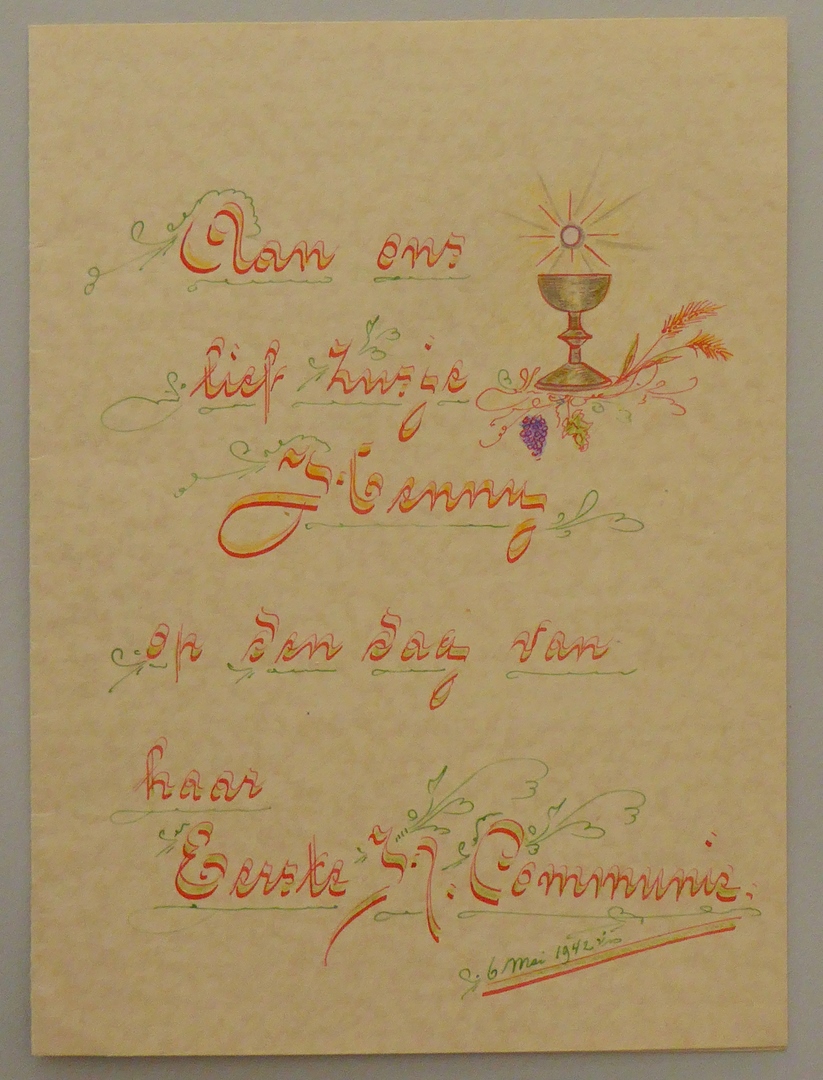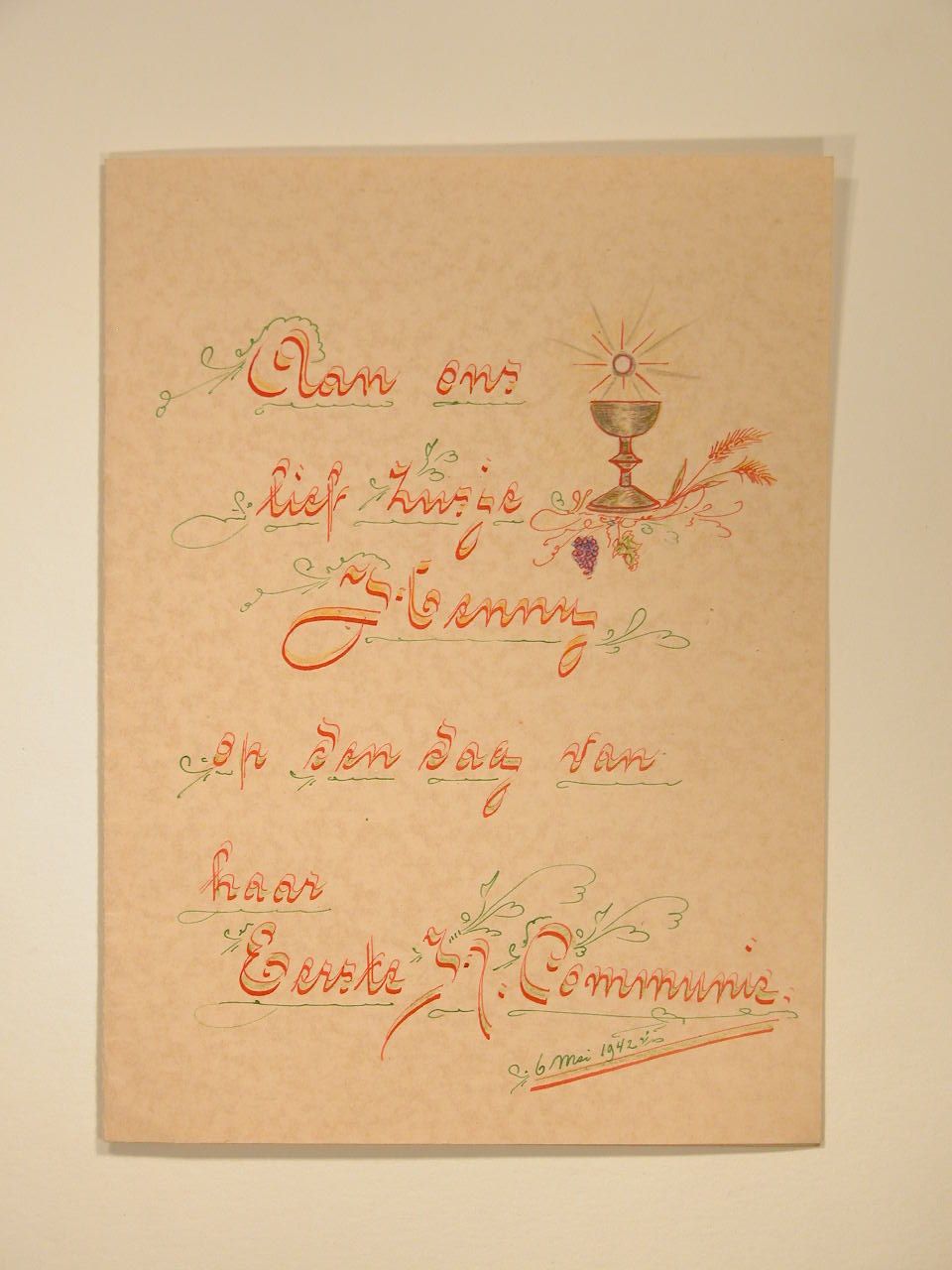 Eerste H. communiewens in omslag met kelk, opgedragen voor zusje Henny door ouder(?) van familie Rijnja