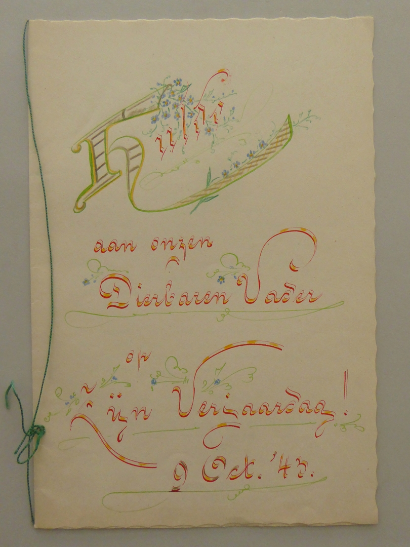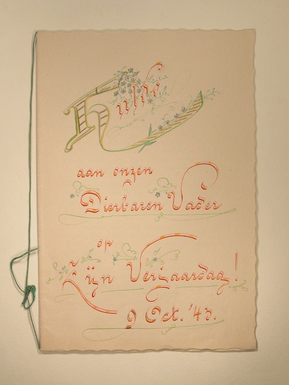 Verjaardagswensen voor vader in omslag met "hulde aan onzen dierbaren vader ... 9 oct 1943", opgedragen door dochters Diny en Jo