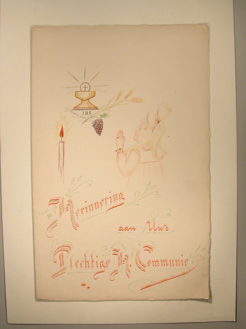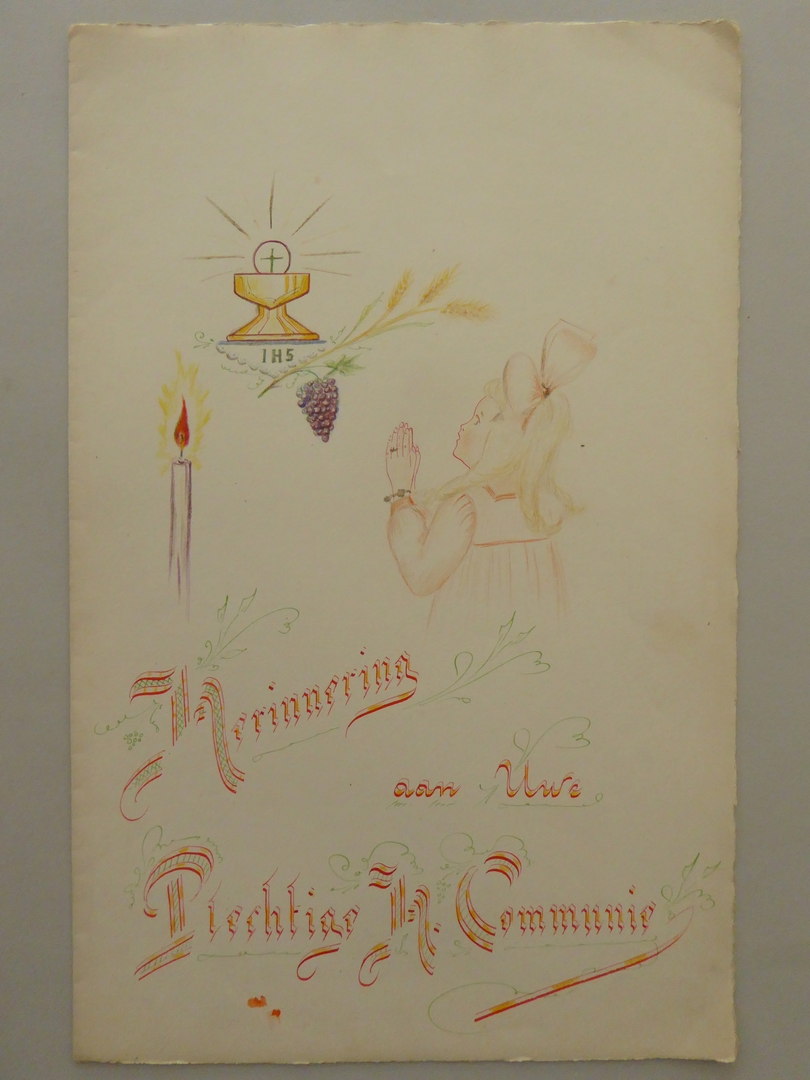 Herinnering aan plechtige H. Communie met kelk, kaars en meisje, opgedragen voor Jo door Diny en Henny