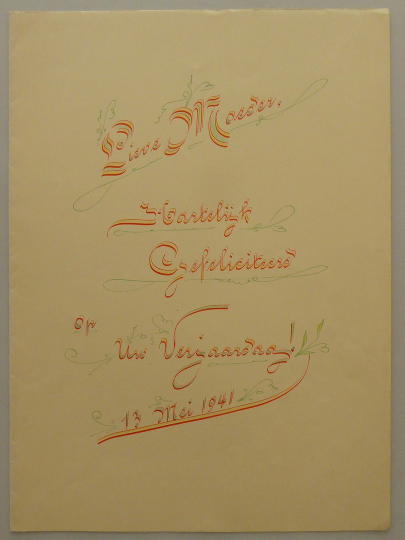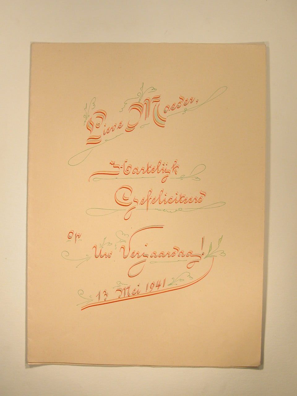 Verjaardagswensjes voor moeder in omslag met "Lieve moeder hartelijk gefeliciteerd ... 13 mei 1941", opgedragen door Ria, Joke, Diny, Henny, Hans en Gerda