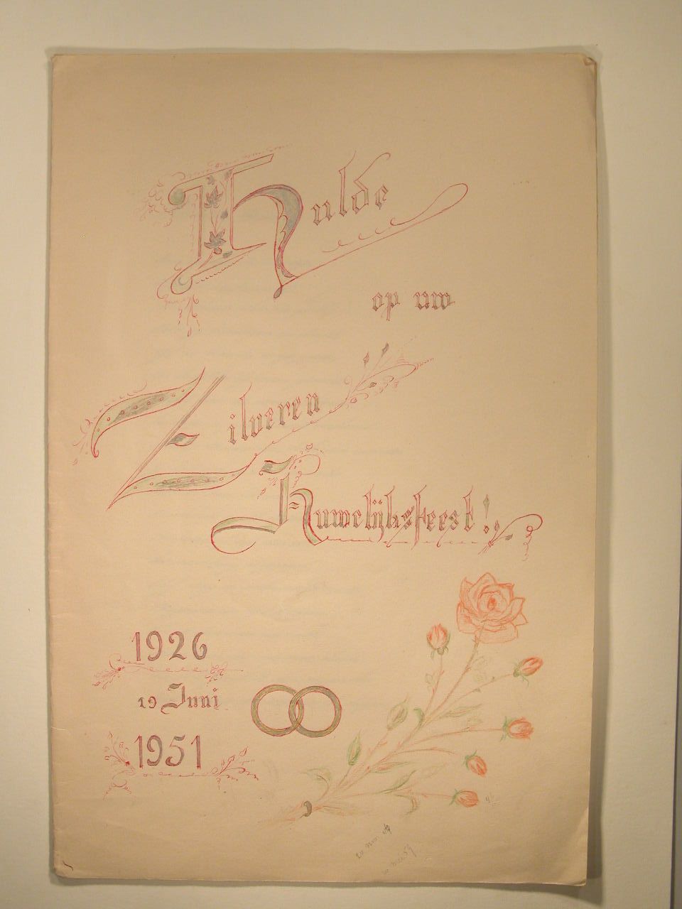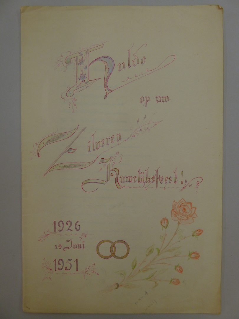 Wensdicht (drie bladen) bij zilveren huwelijksfeest in omslag met roos en "Hulde op uw zilveren huwelijksfeest 1926 19 juni 1951", opgedragen voor ouders door Hans