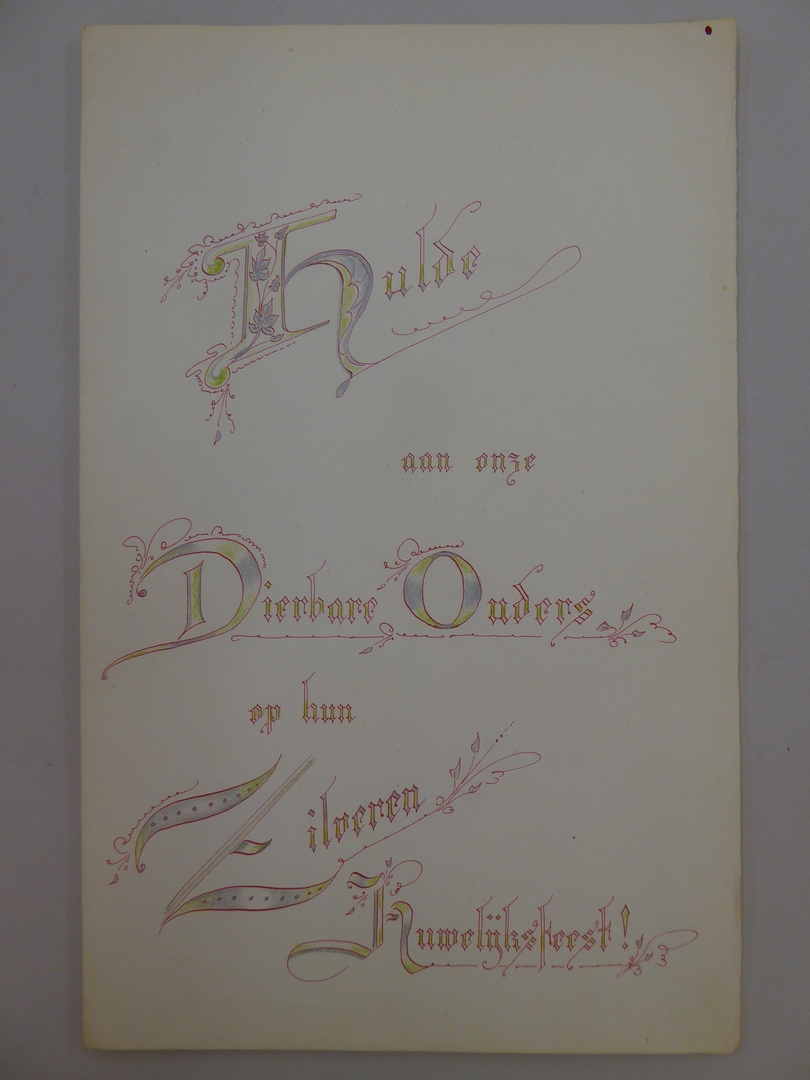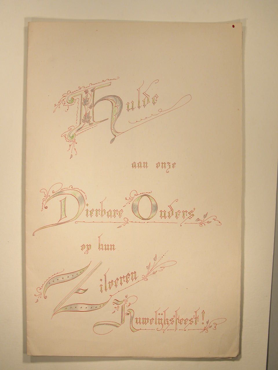 Omslag met "Hulde aan onze dierbare ouders op hun zilveren huwelijksfeest!" waarin tien gebonden bladen, opgedragen aan ouders door de kinderen