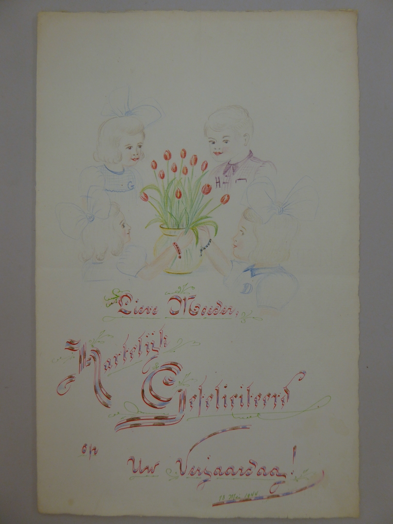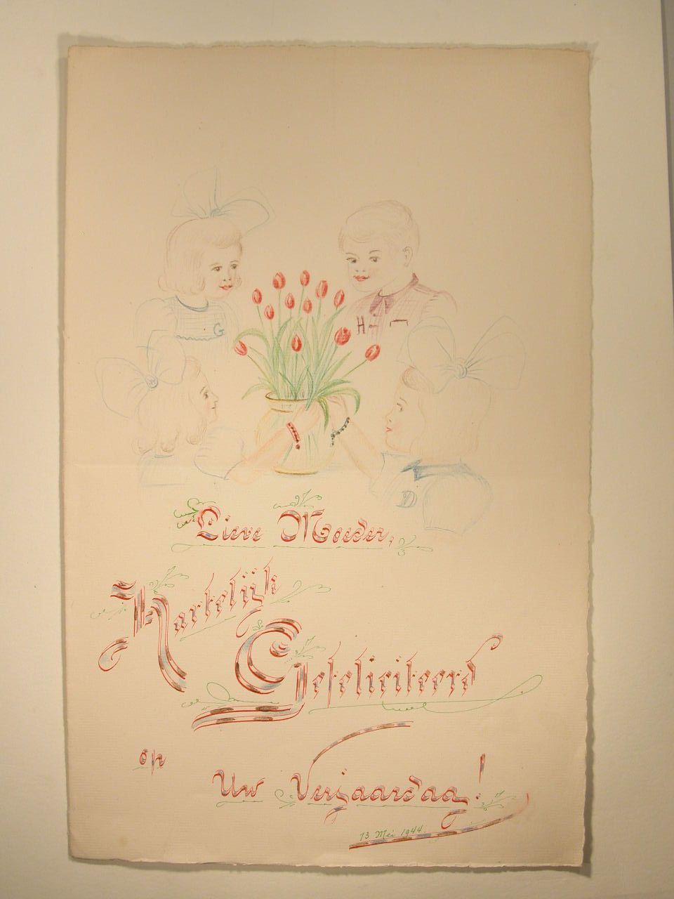 Voorzijde van omslag(?) met drie meisjes en een jongen en "Lieve moeder, hartelijk gefeliciteerd op uw verjaardag 13 mei 1944"