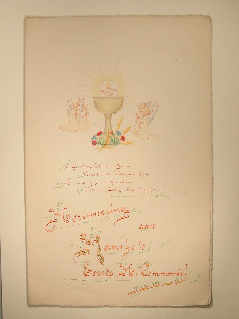 Eerste communiewens met kinderen als engel en communicantje in kelk, opgedragen voor broertje Hans door zusjes Diny en Jo