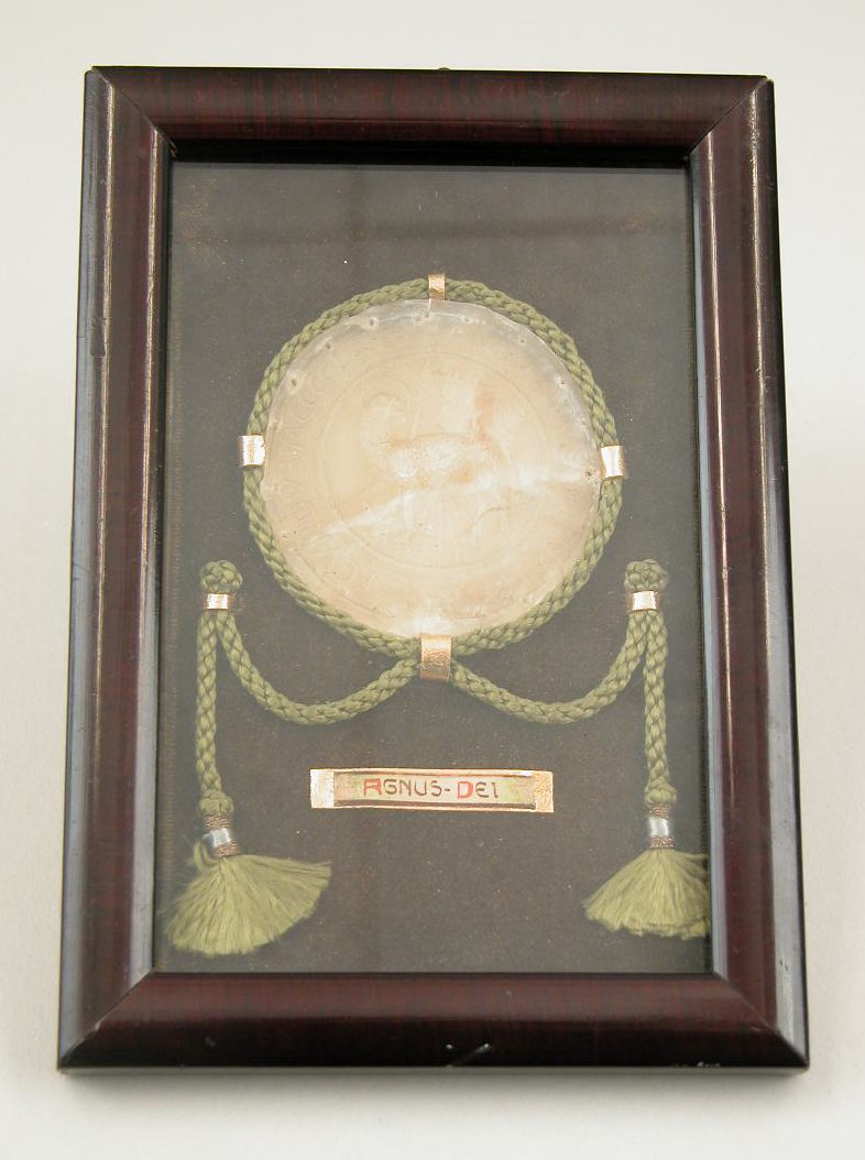Agnus Dei Paulus II met "Paulus Venetus papa secundus MCCCCLX ...(?)", in lijstje met opgeplakt teksthoudertje waarin tekst met betekenis van Agnus Dei