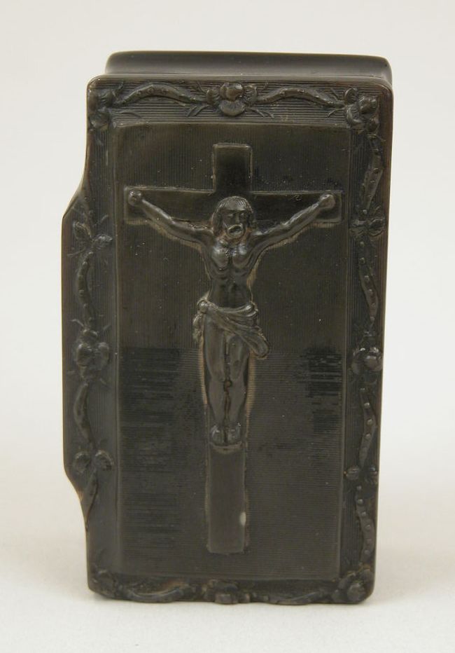 Tondeldoos van gemalen walvisbalein met Christus aan het kruis op deksel