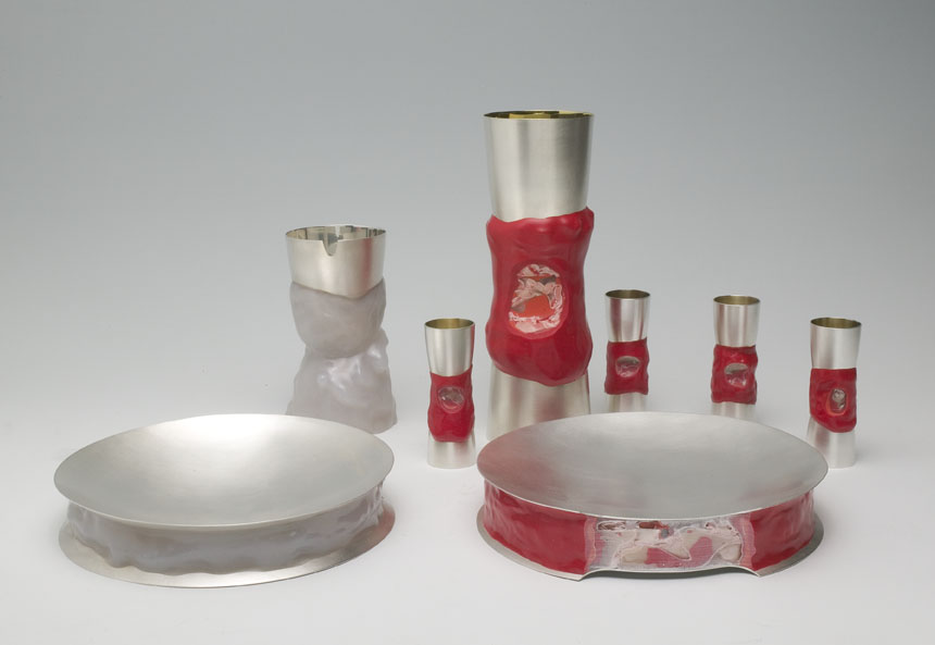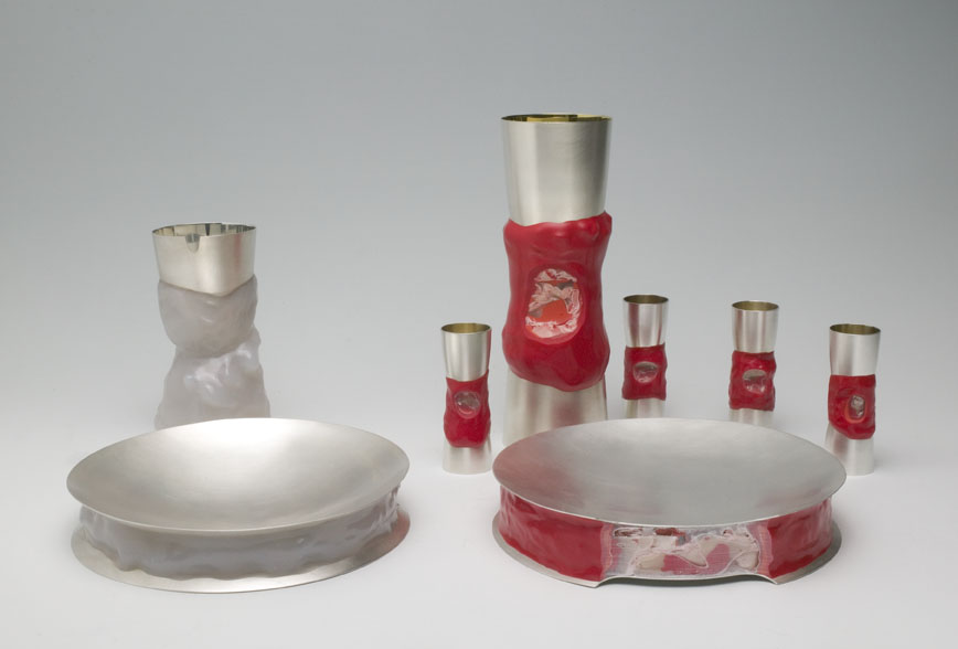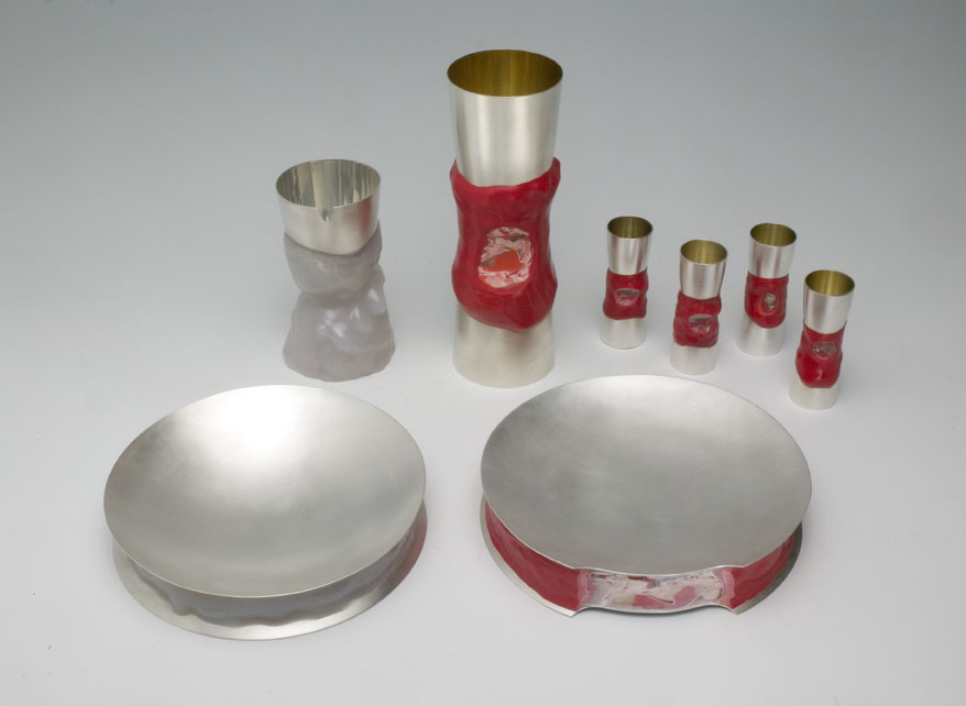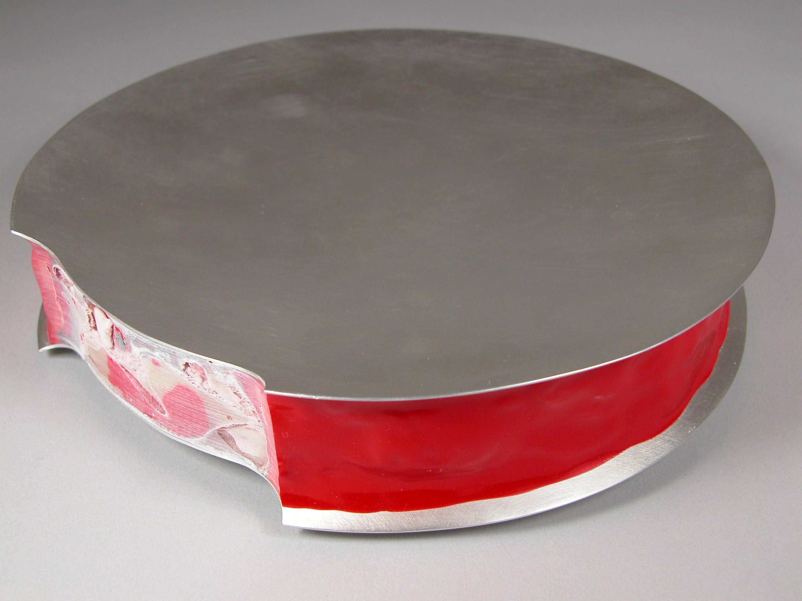 Avondmaalsbord met rode giethars waaruit deel van de rand is weggezaagd