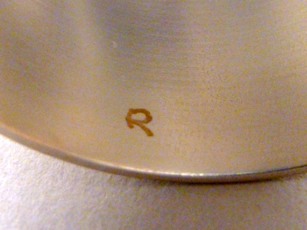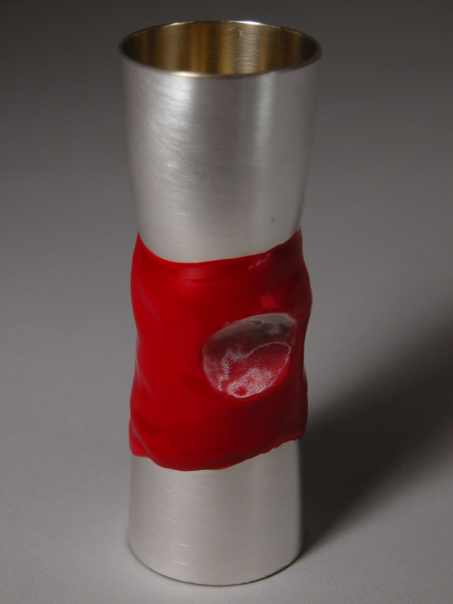 Avondmaalsbekertje met rode giethars waaruit klein deel is weggezaagd