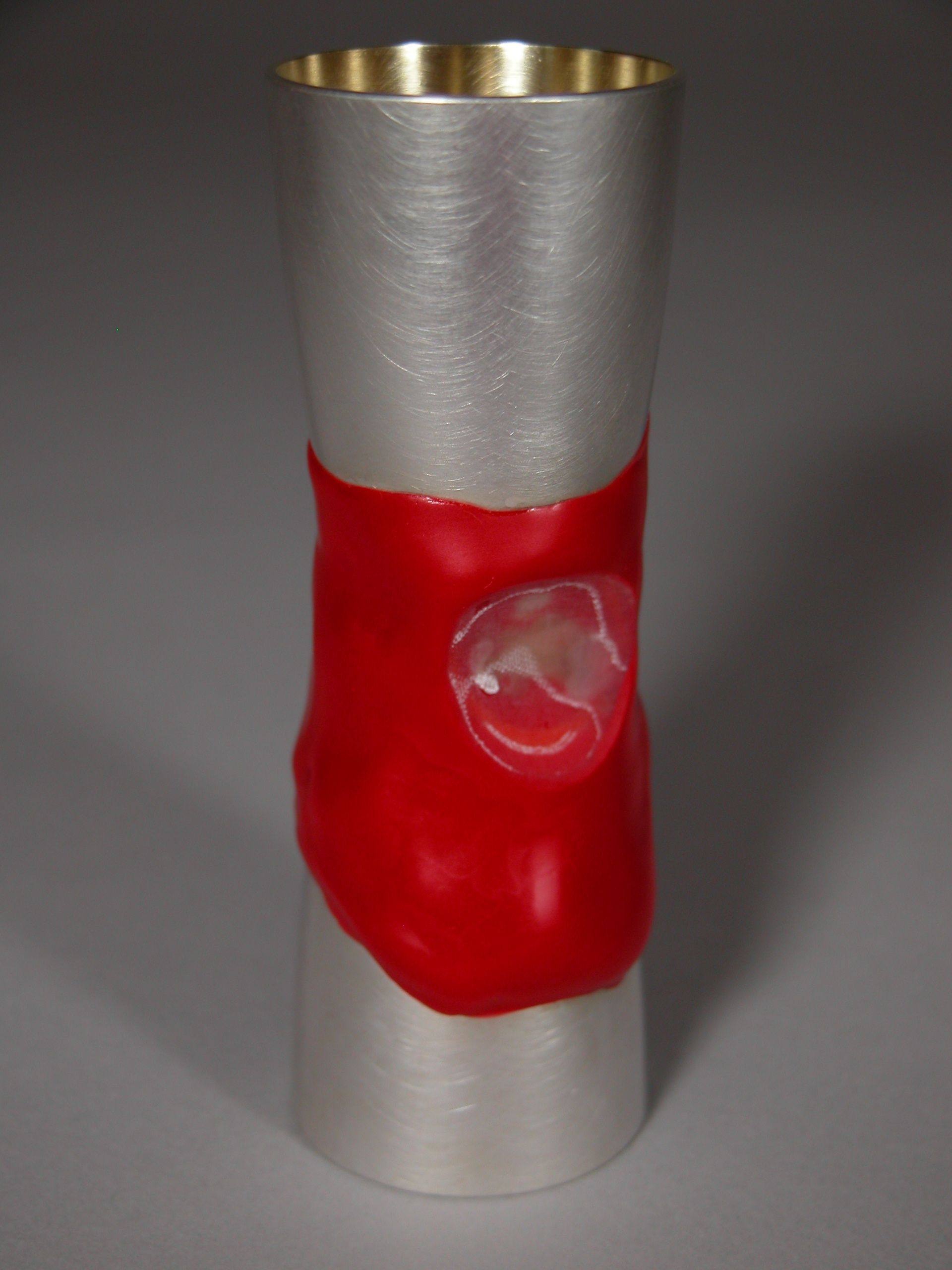 Avondmaalsbekertje met rode giethars waaruit klein deel is weggezaagd