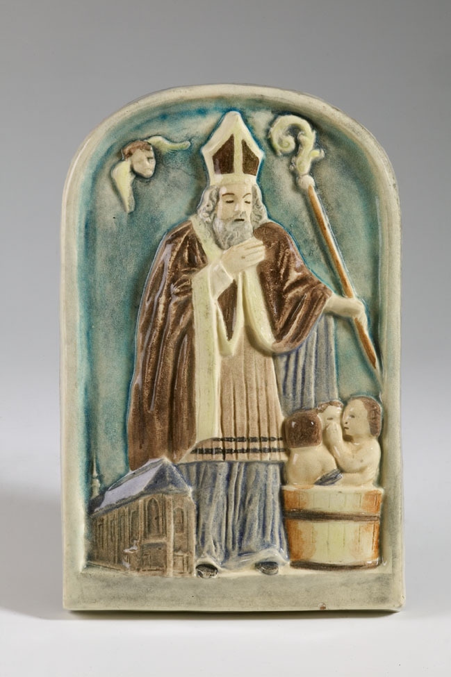 Sint Nicolaas met staf en aan zijn voeten een kerk en een tobbe met drie kinderen