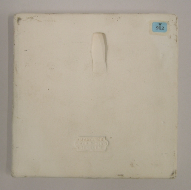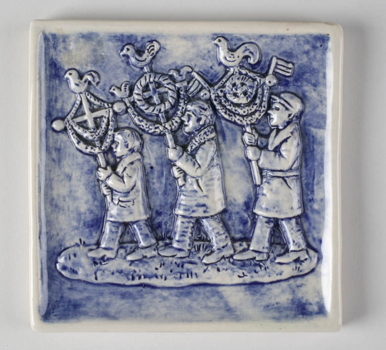 Wandtegel in blauw en wit met in reliëf drie lopende kinderen met palmpasenstokken