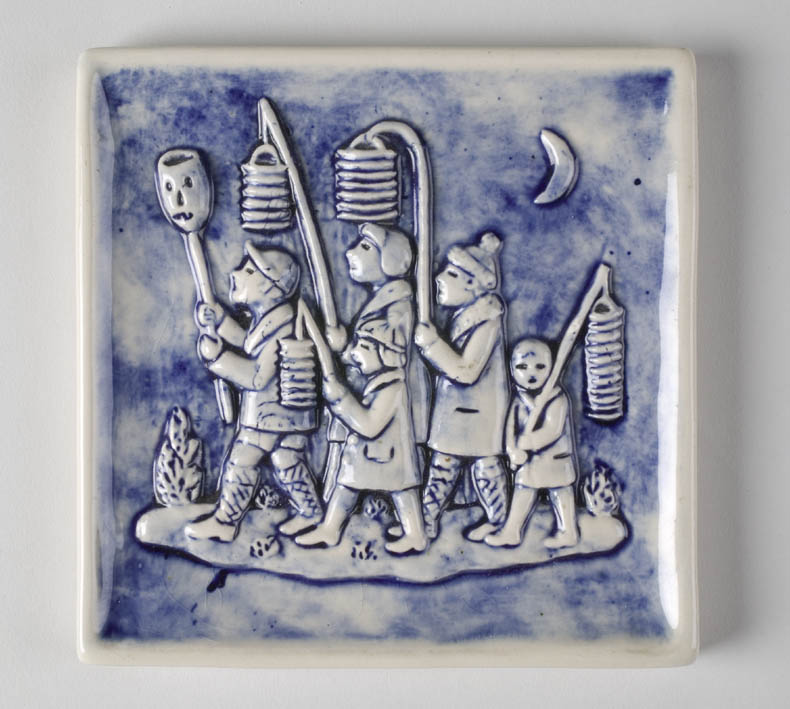Wandtegel in blauw en wit met in reliëf vijf lopende Sint-Maartenszangertjes met lampions