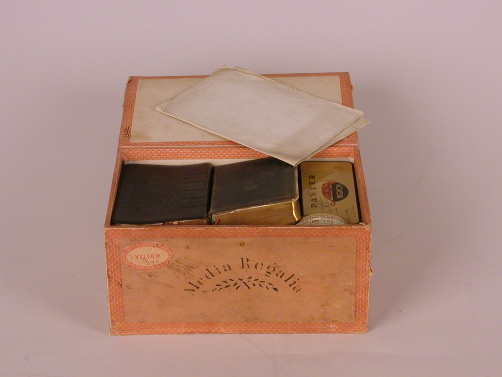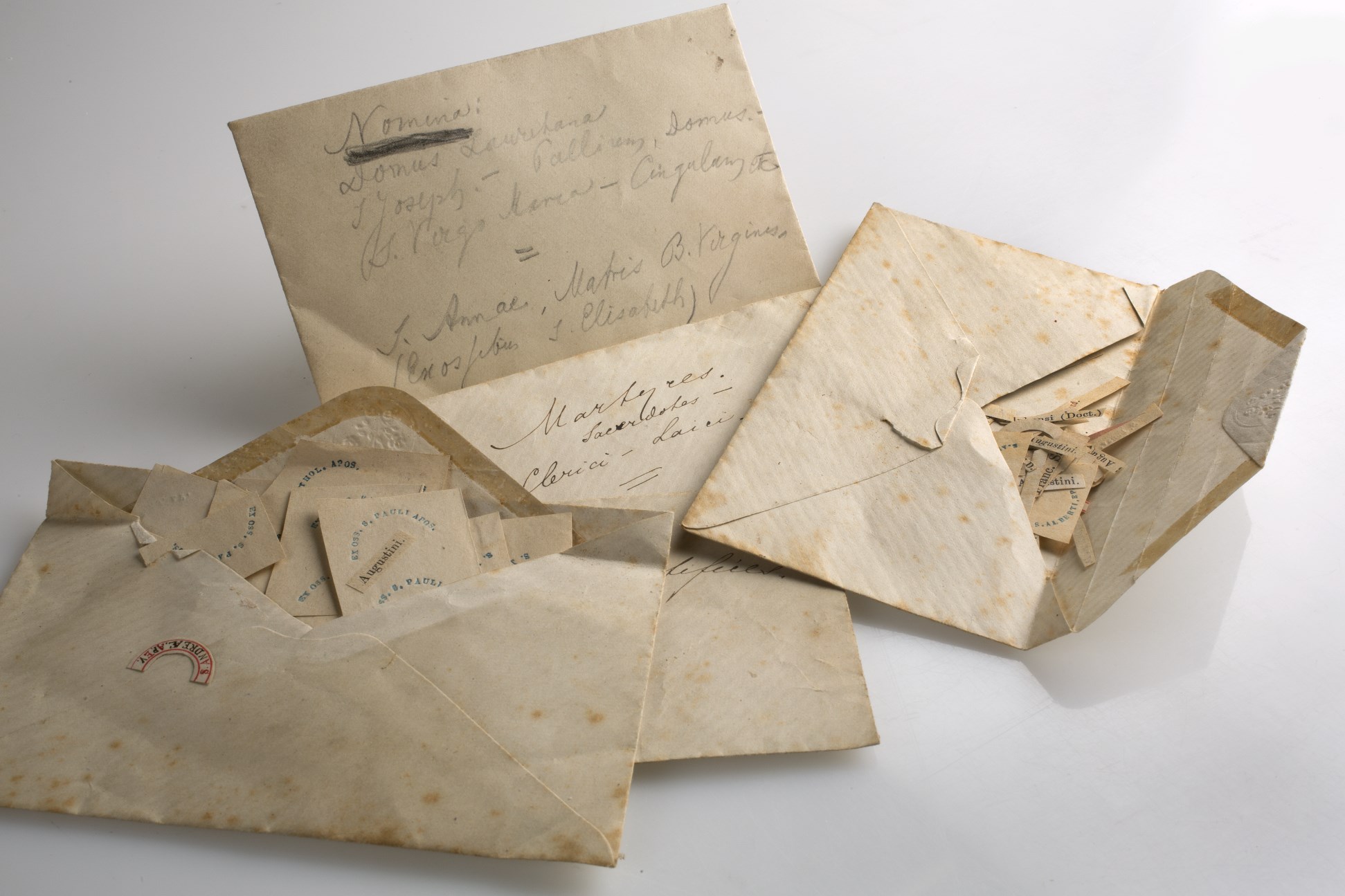 Benodigdheden voor het maken van reliekmedaillons: sigarendoosje met daarin onder andere twee brevieren waaruit namen zijn geknipt, doosjes met relieken, enveloppen met de uitknipte namen, namenlijst