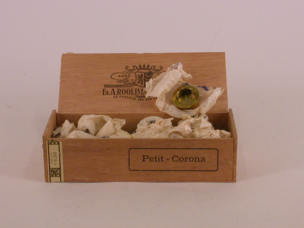 Benodigdheden voor het maken van reliekmedaillons: sigarendoosje met daarin lege reliekmedaillons omhuld in papiertjes