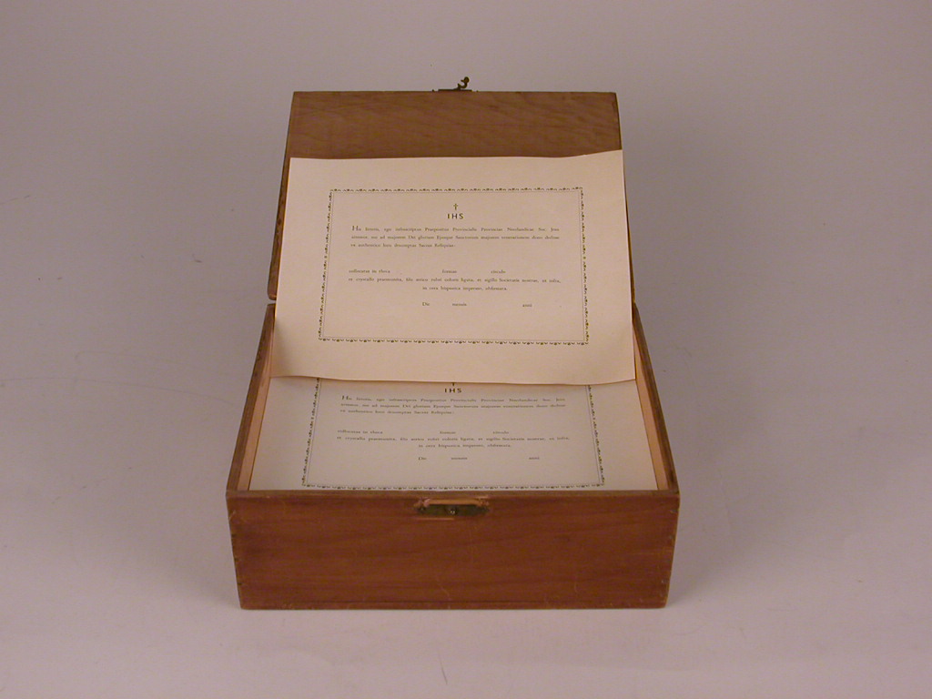 Benodigdheden voor het maken van reliekmedaillons: sigarendoosje met daarin oningevulde echtheidsverklaringen