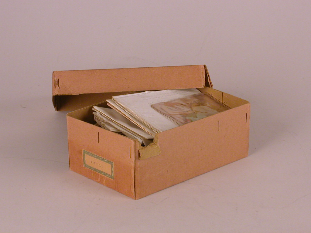 Benodigdheden voor het maken van reliekmedaillons: kartonnen doosje met etiket "Agnus Dei" met daarin onder andere Agnus Dei en verschillende documenten