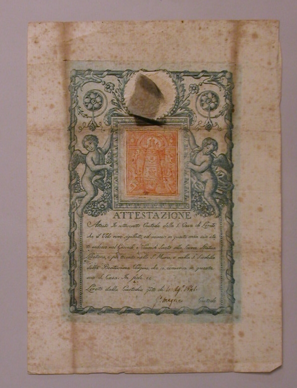 Benodigdheden voor het maken van reliekmedaillons: Stofreliek op papier met "Attestazione ... casa di Loreto ..."
