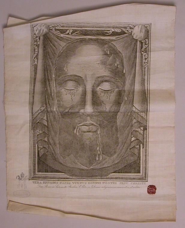 Benodigdheden voor het maken van reliekmedaillons: Vera icon (Veronicadoek) met "Vera Effigies Sacri Vultus Domini Nostri Jesu Christi"