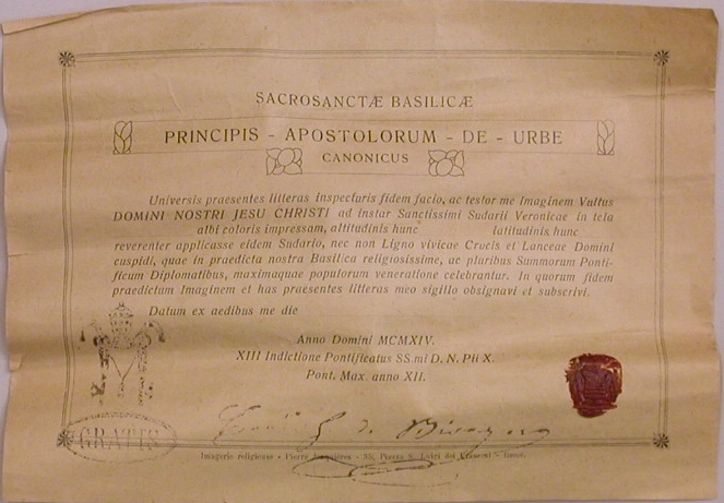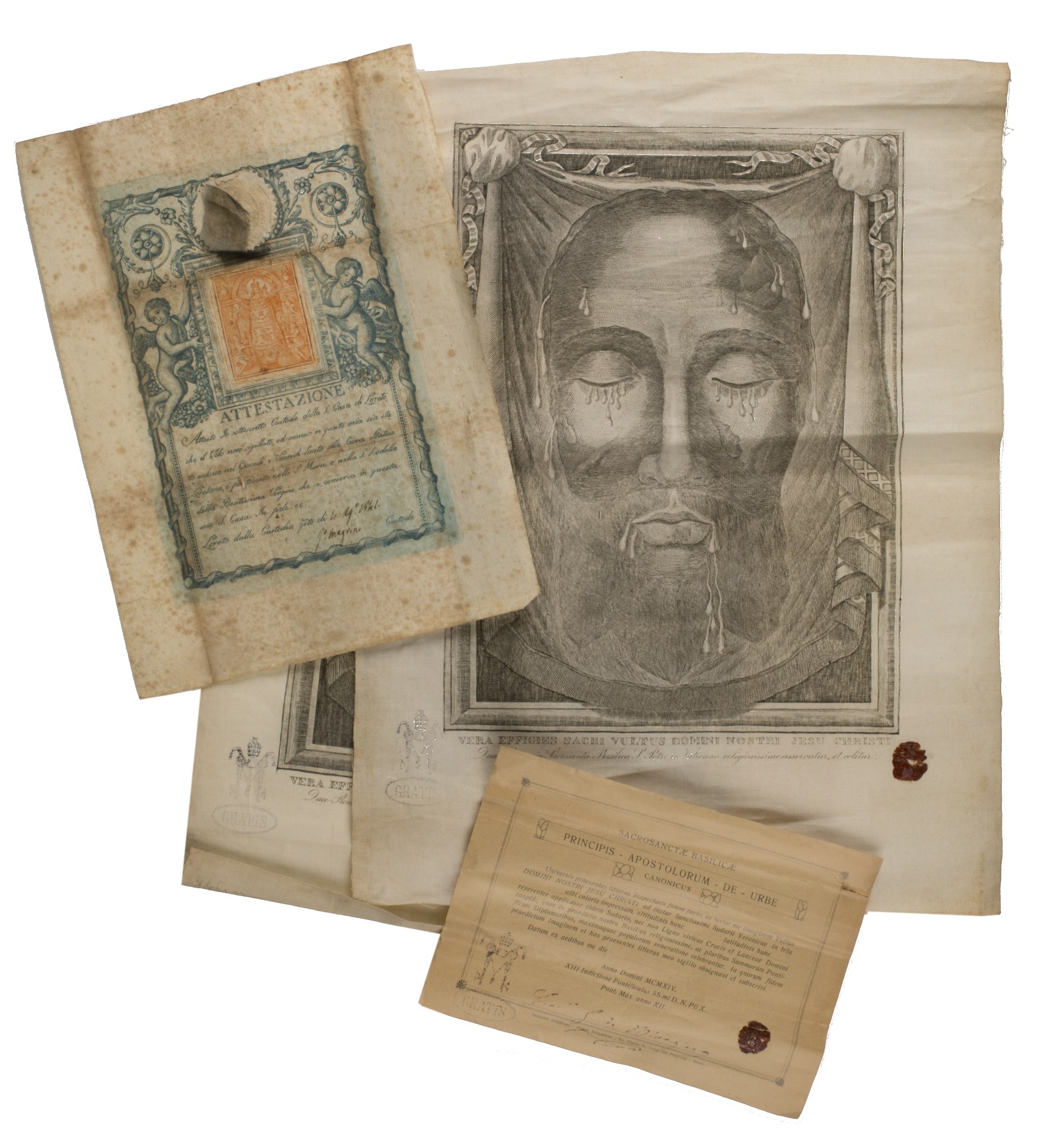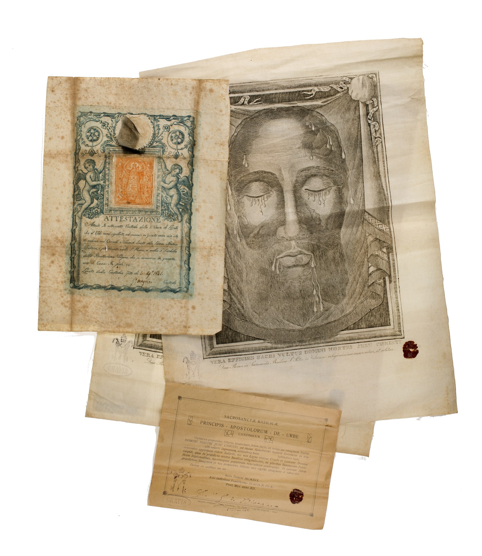 Benodigdheden voor het maken van reliekmedaillons: echtheidsverklaring behorende bij Vera icon (Veronicadoek) met "... Imaginem Vultus Domini Nostri Jesu Christi ad instar Sanctissimi Sudarii Veronicae ..."