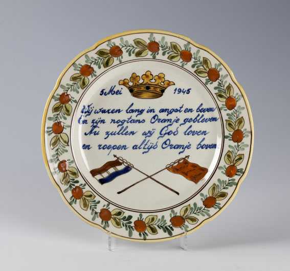Wandbord t.g.v. einde Tweede Wereldoorlog met kroon, twee vlaggen en met "5 mei 1945 Wij waren lang in angst en beven ... Nu zullen wij God loven en roepen altijd Oranje boven."