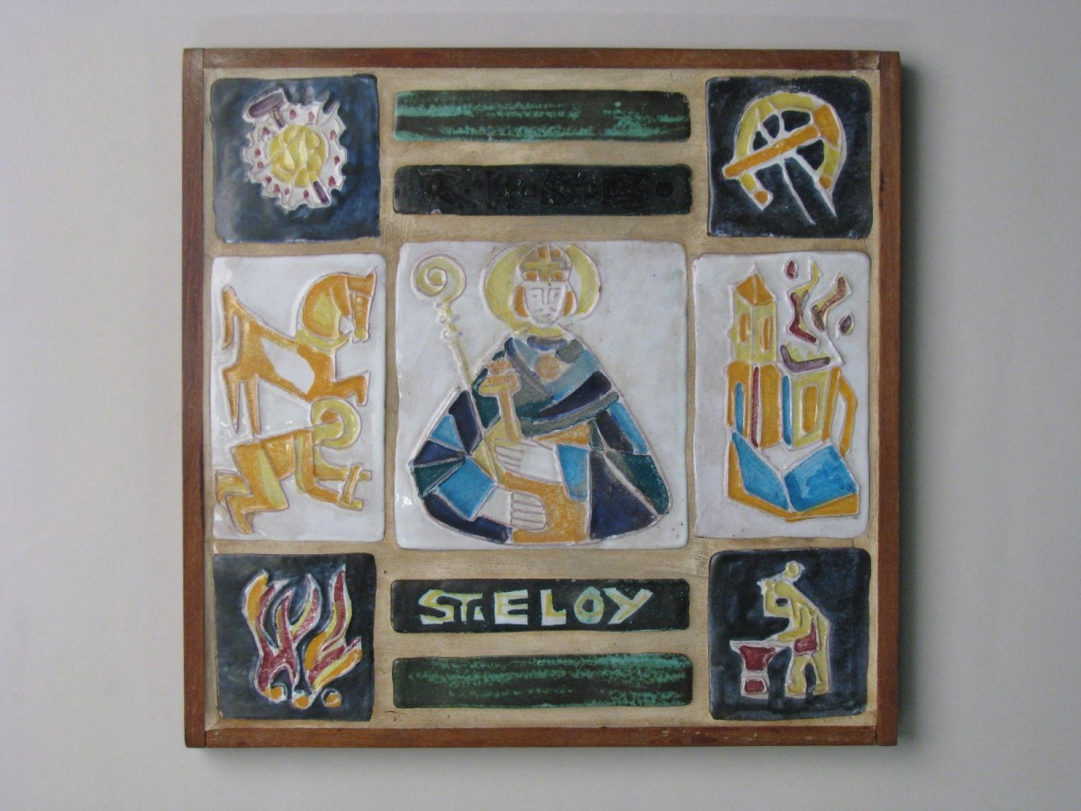Tegeltableau van de Rooms Katholieke Bond van Smedenpatroons met "R.K.S.B.", centraal St. Eloy, links van boven naar beneden het logo, Eloy die poot van paard beslaat na amputatie en een vuur en rechts van boven naar beneden hamer en hoefijzer, kerk met brandend dak, smid met aambeeld. Op de achterzijde een etiket met "Aangeboden door ...